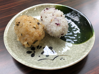 今回は賞味期限の迫った防災備蓄食品の入れ替えに伴い、しそごはんと山菜おこわの2種をおにぎりにして提供しました。