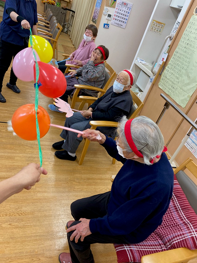 風船たたきでは風船が割れる音にびっくりしながら