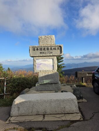 その後、日本一高い国道の記念碑をパチリ📸。切り立った断崖を横目に震え上がり、熊の湯温泉へ…。