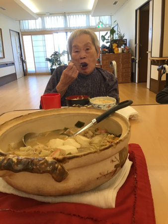 楓フロアでは冬の風物詩、お鍋を皆様で召し上がりました。白菜、ネギ、人参等、野菜を見て、「美味しそうな野菜や、鍋するんか?早く食べたいな」と仰っていました。お鍋を召し上がっていただき体も温かくなり、皆様でほっこりとなっていただきました。