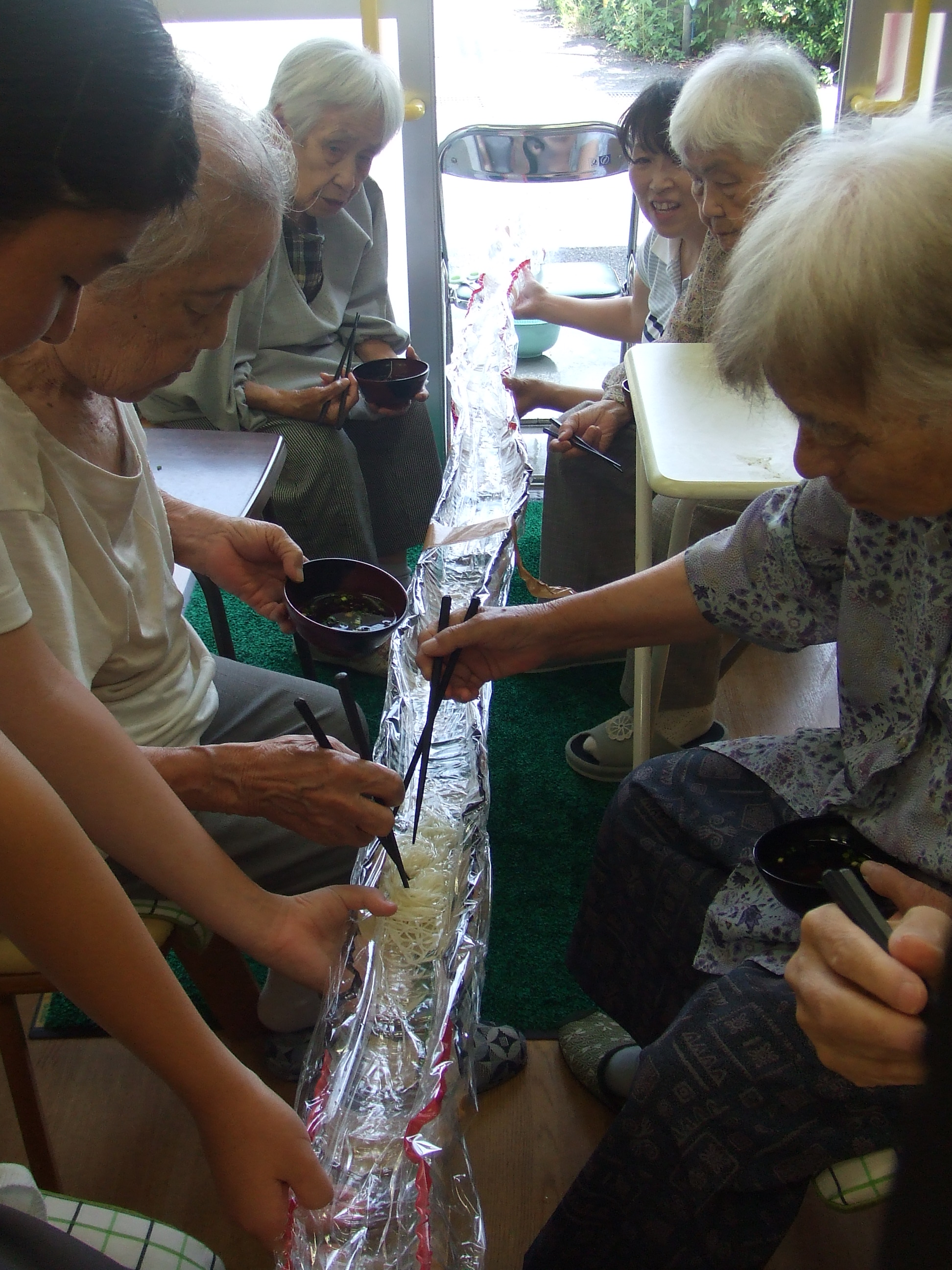 ペットボトルを半分に切り組み合わせ、昼食時に流しそうめんを行いました。皆様、うまく流れてくるそうめんをつかみ、美味しく食べられてみえました。