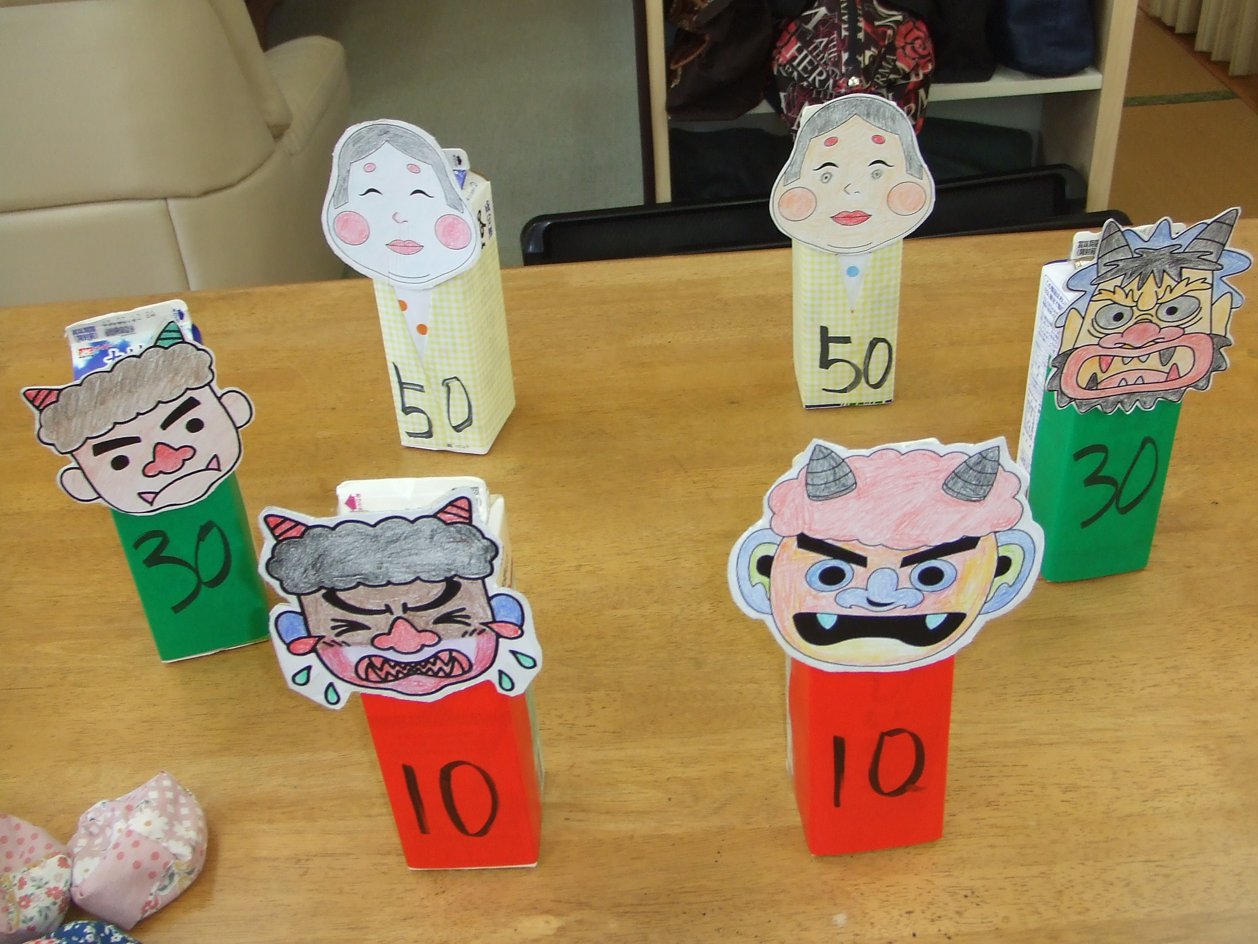 鬼退治では事前に塗り絵をして頂いた鬼を牛乳パックに貼り、