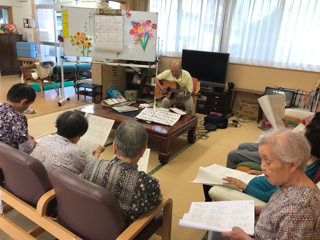 脳トレ後はギター演奏に合わせ、演歌など