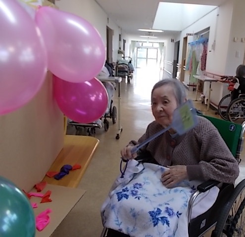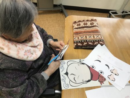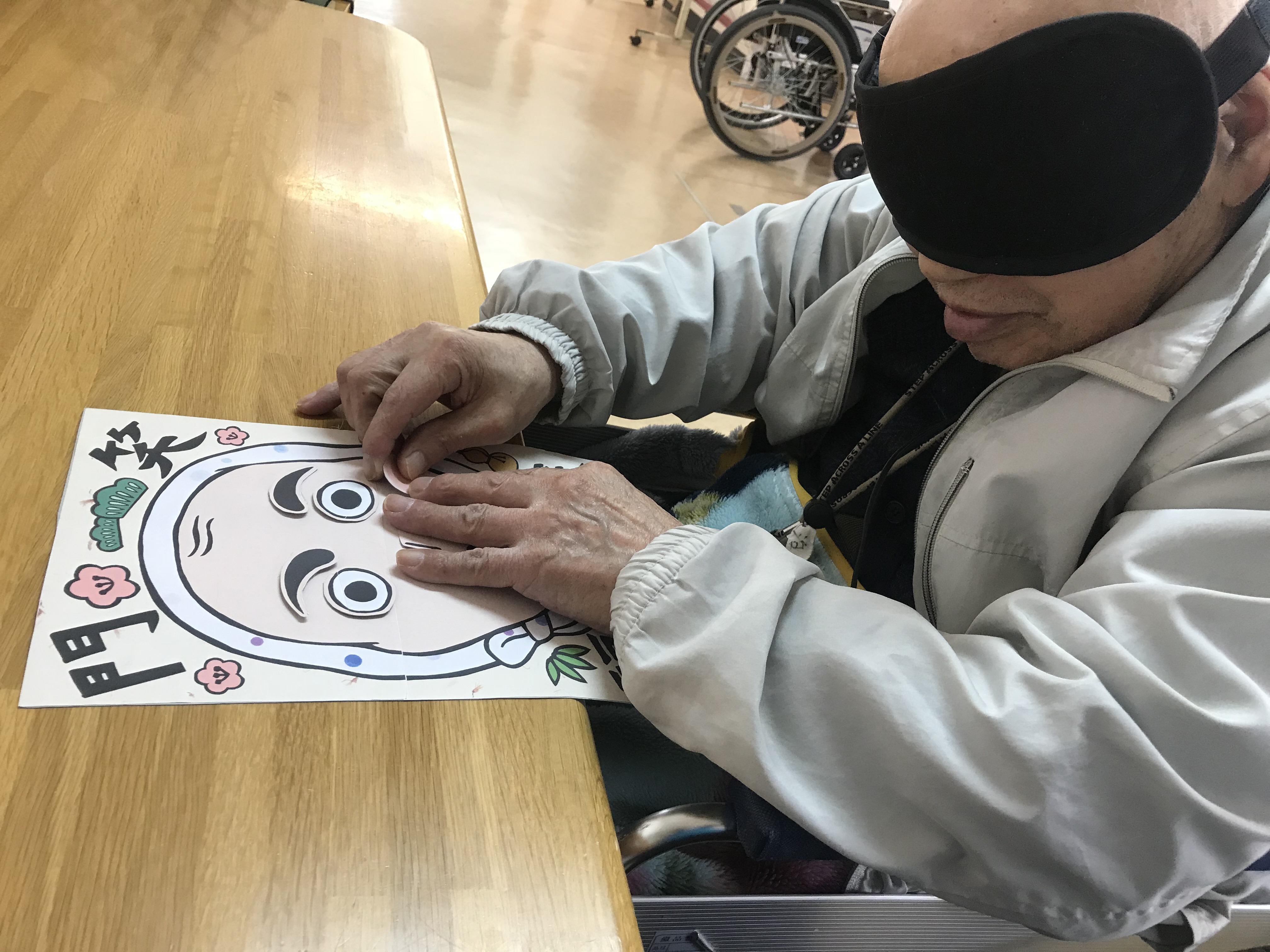 福笑いをしました。この福笑いはご利用者のMさんが1つ1つ丁寧に切って作って下さいました。当日はアイマスクをしてひょっとこを作りました。