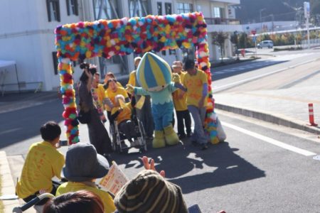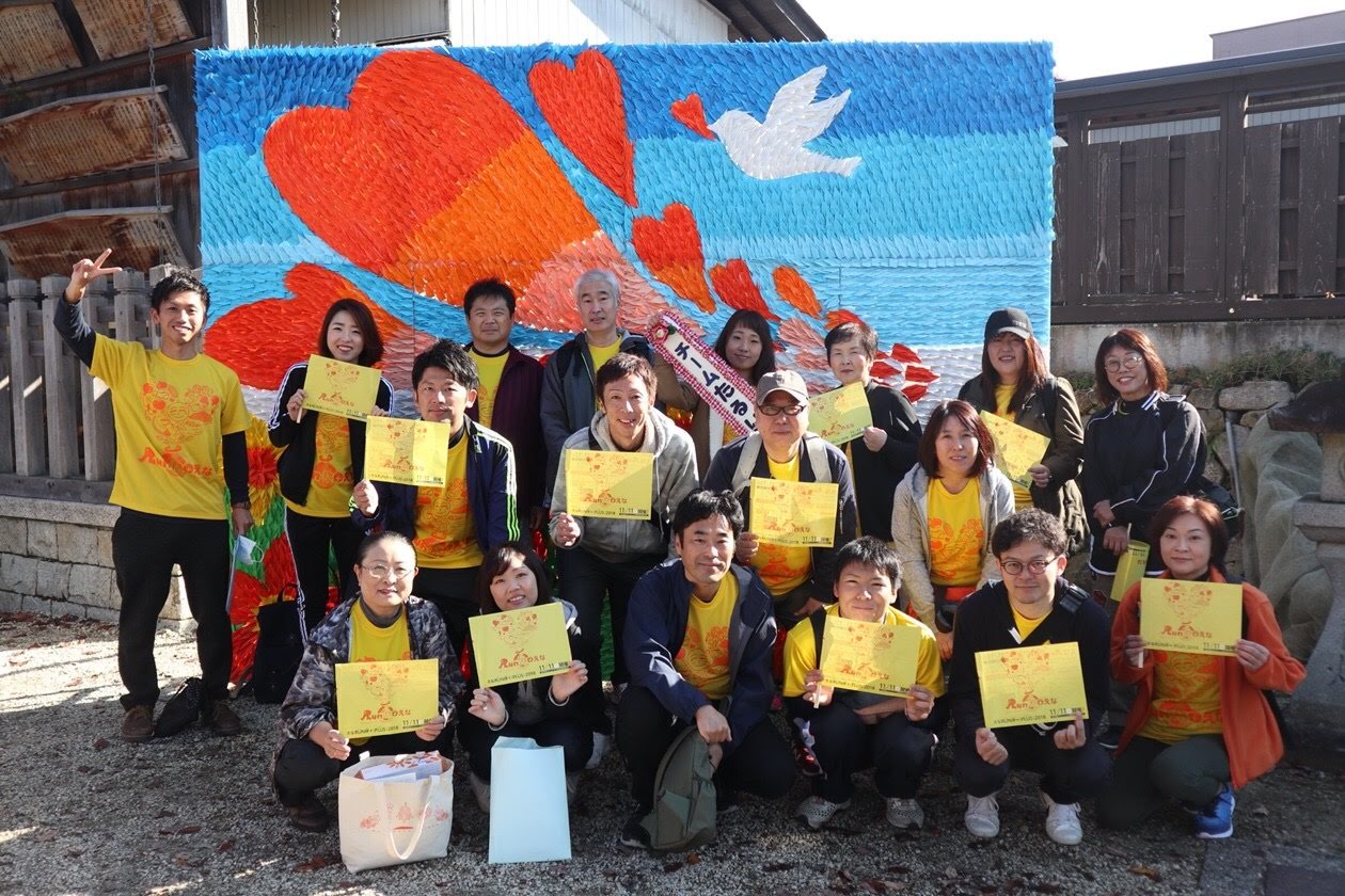 私達は朝ドラ「半分、青い。」のロケ地である岩村町から市役所を目指してタスキを繋ぎました。私達の後ろの巨大な貼り絵は何と岩村地区の人口と同じ4938羽の折り鶴!スーパー、喫茶店、銀行、福祉事業所などに折り鶴スポットを設置し岩村地区住民皆様で作成された作品とのことです!!