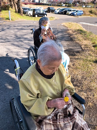 たんぽぽの綿毛をお渡しすると「ふーっ」と息をかけ綿毛を飛ばされ入居者様同士、