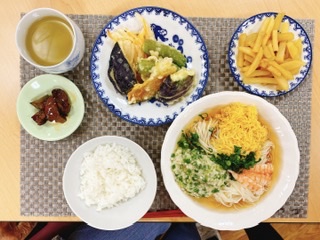 今日の昼食は、そうめんとはつらつ農園で収穫した野菜で、野菜の天ぷらでした😋