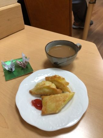 レクリエーションの後には揚げたさつまいもの春巻きと餃子です