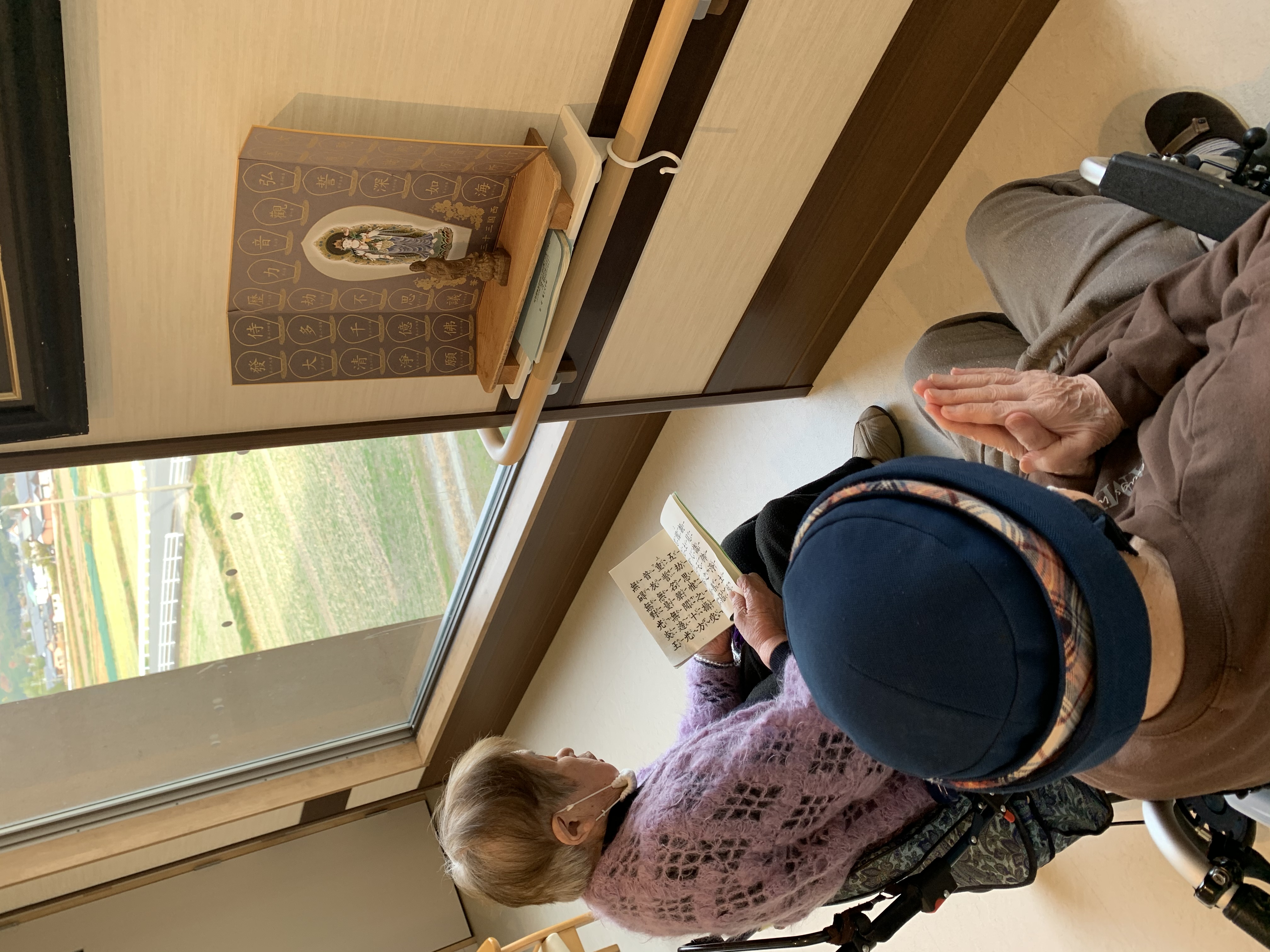 毎日のお勤めをされている方の紹介をします。シルバーカーを押し歩いて目的地に向かいます!お経をこうして唱えた後に「今日も元気でありがとうございました」と感謝されています。とても明るく元気な方です。これからも楽しく過ごせたら職員も幸せです❣️