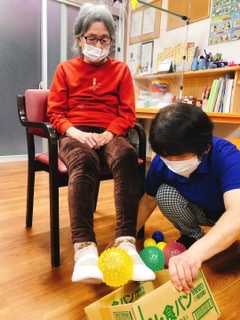 今日のレクはボールを両足で挟んで箱に入れる