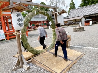 夏越の祓とも呼ばれているそうで、6月30日に茅(ちがや)というイネ科の植物で編んだ大きな輪をくぐり、心身を清めて災厄を祓い、無病息災を願う行事だそうです。