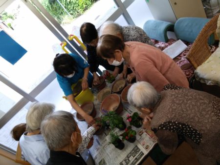 「この鉢にはこの花にしよう」「この花はこっちがいいんじゃない」と皆さんで、わきあいあいと植えて下さいました。