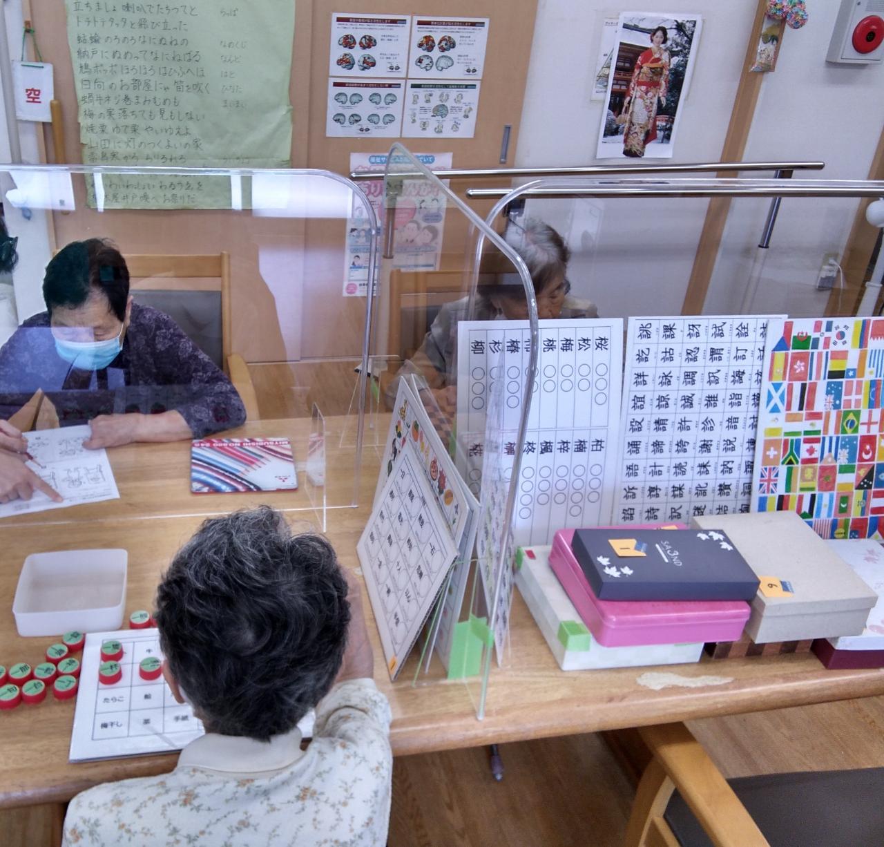 塗り絵を選んで取り組まれる方、職員と一緒に間違い探しに取り組まれる方、