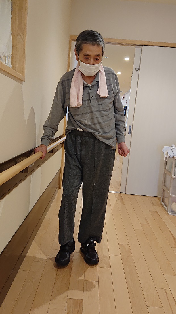 楓東ユニットのI様です。定期的に歩行訓練を実施しています。当初は職員が左脇を支えながら歩行訓練していましたが、現在は職員の補助なしで手すりを使用し歩行できるようになりました。