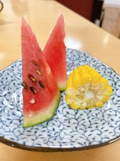 本日のおやつは「はつらつ農園」で収穫したスイカ🍉と、とうもろこし🌽です。
