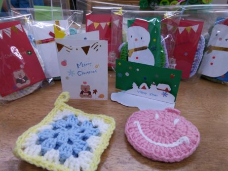 今年のプレゼントは職員が編んだ『アクリルたわしセット』と『手作りクリスマスカード』と『ご利用者のご家族の手作りマスク』です🎁