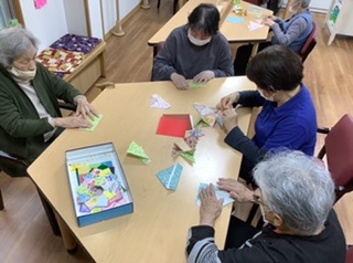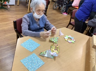 昼食の後、折り紙でリース作りをしていただきました