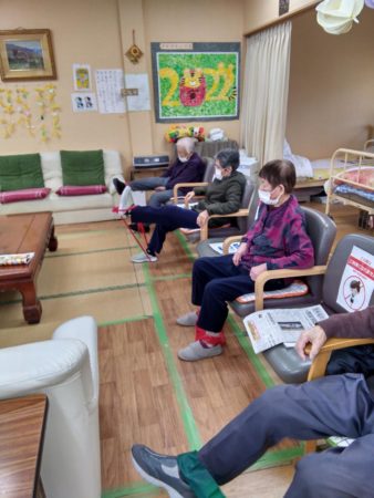 セラバンドを使ってストレッチをすることによって肩こりなども解消されるので、職員も体操中に
