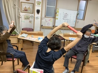 機能訓練士と一緒にカラフルな棒を使って楽しくリハビリ体操に参加をしていただきました