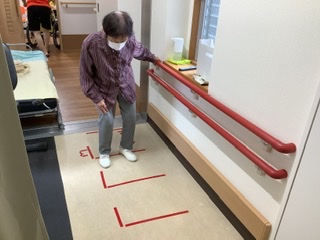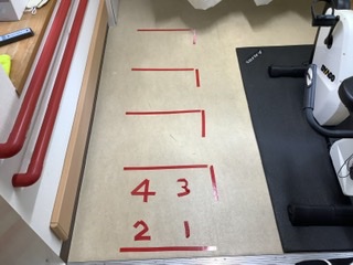 床に赤色のテープを貼り順番に足を動かすリハビリです