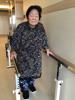 椿西ユニットのT様です。今までは自分の居室でベッドの手すりを使って歩行訓練をされていましたが、今日は平行棒を使って歩行訓練をされました。大変喜ばれ、今後も継続していきます。