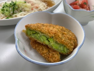 今日は、旬真っ盛りの「枝豆」のフライを食事に出しました。