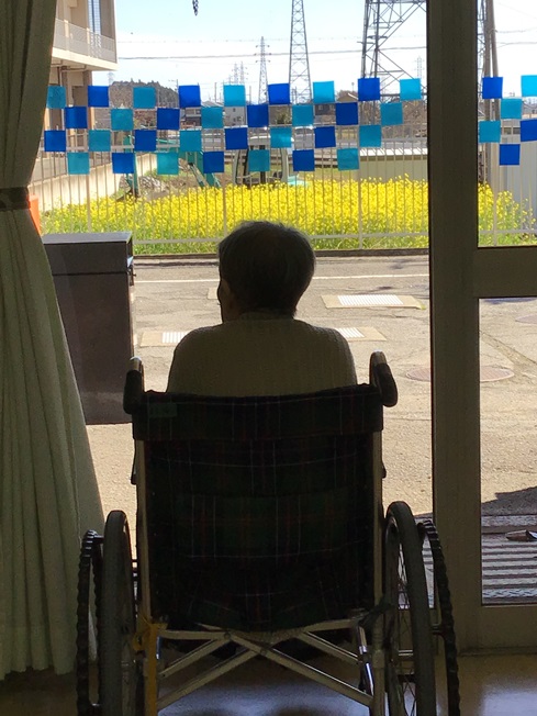 いぶき苑本館の東の通用口から眩しく咲き誇る菜の花畑が見えます。ご利用者が散歩の途中に一休み。春爛漫もうすぐ桜も満開です。今年こそは、桜を見ながらお団子が食べられるといいです。🍡