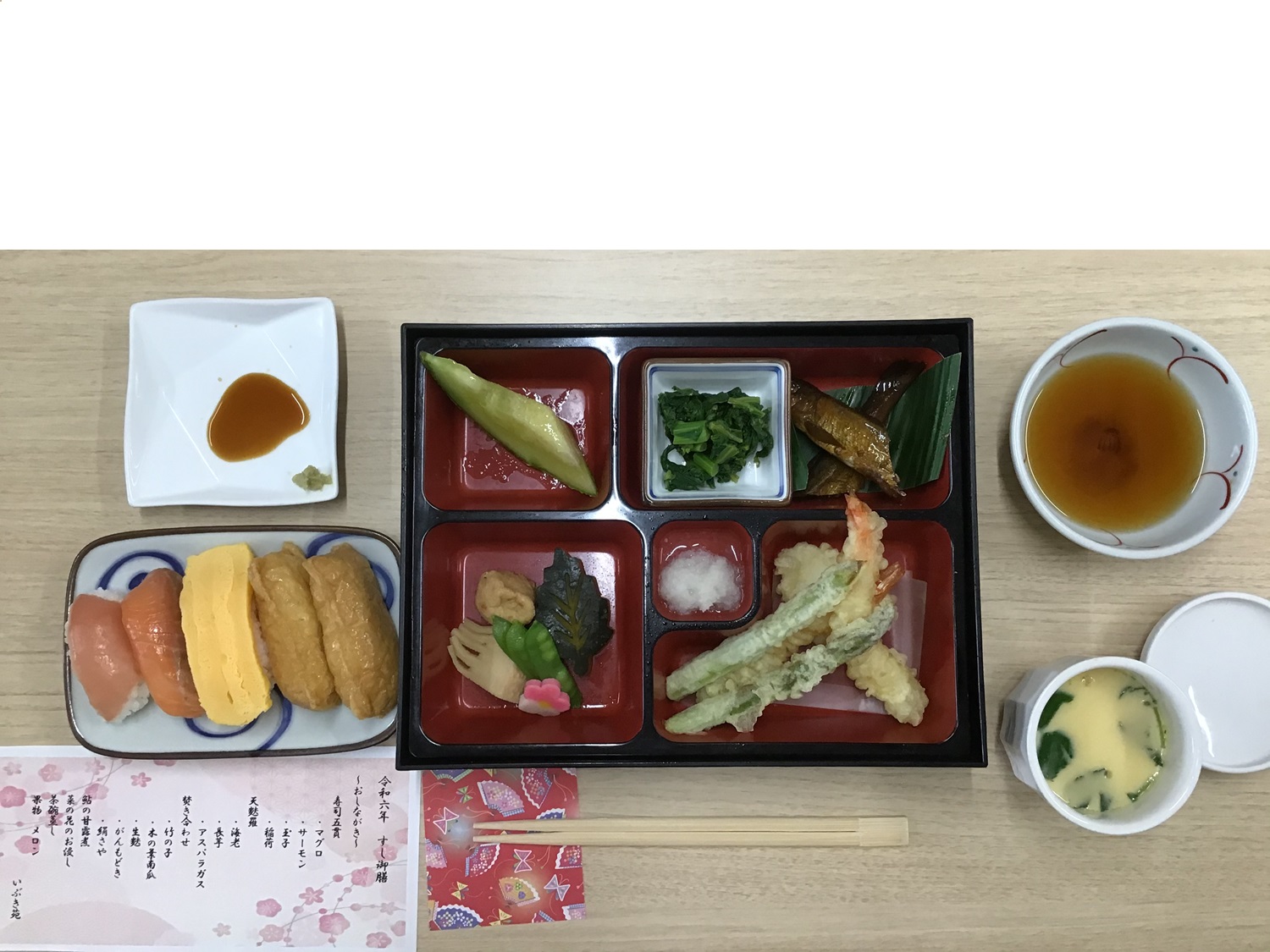 ・寿司5貫(マグロ/サーモン/玉子/いなり)・果物:メロン