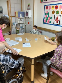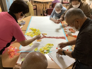 皆さんで協力して取り組まれる事で交友関係も拡がり、貼り絵を終えた後も楽しそうにお話しされる様子が見られました。