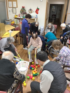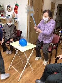 本日のレクリエーションは、巻き巻きゲームや風船送り、風船を叩いて割るなどのいろいろなゲームに挑戦していただきました