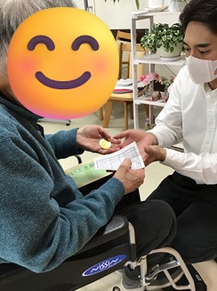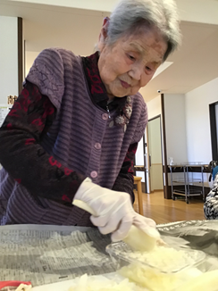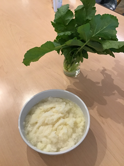 1月16日 大根を収穫しました。「大根の葉っぱは油揚げと一緒に炒めると美味しいよ」等会話もはずみました。あまり太くなりませんでしたが、皆で大根おろしを作り、夕食の1品となり美味しくいただきました。