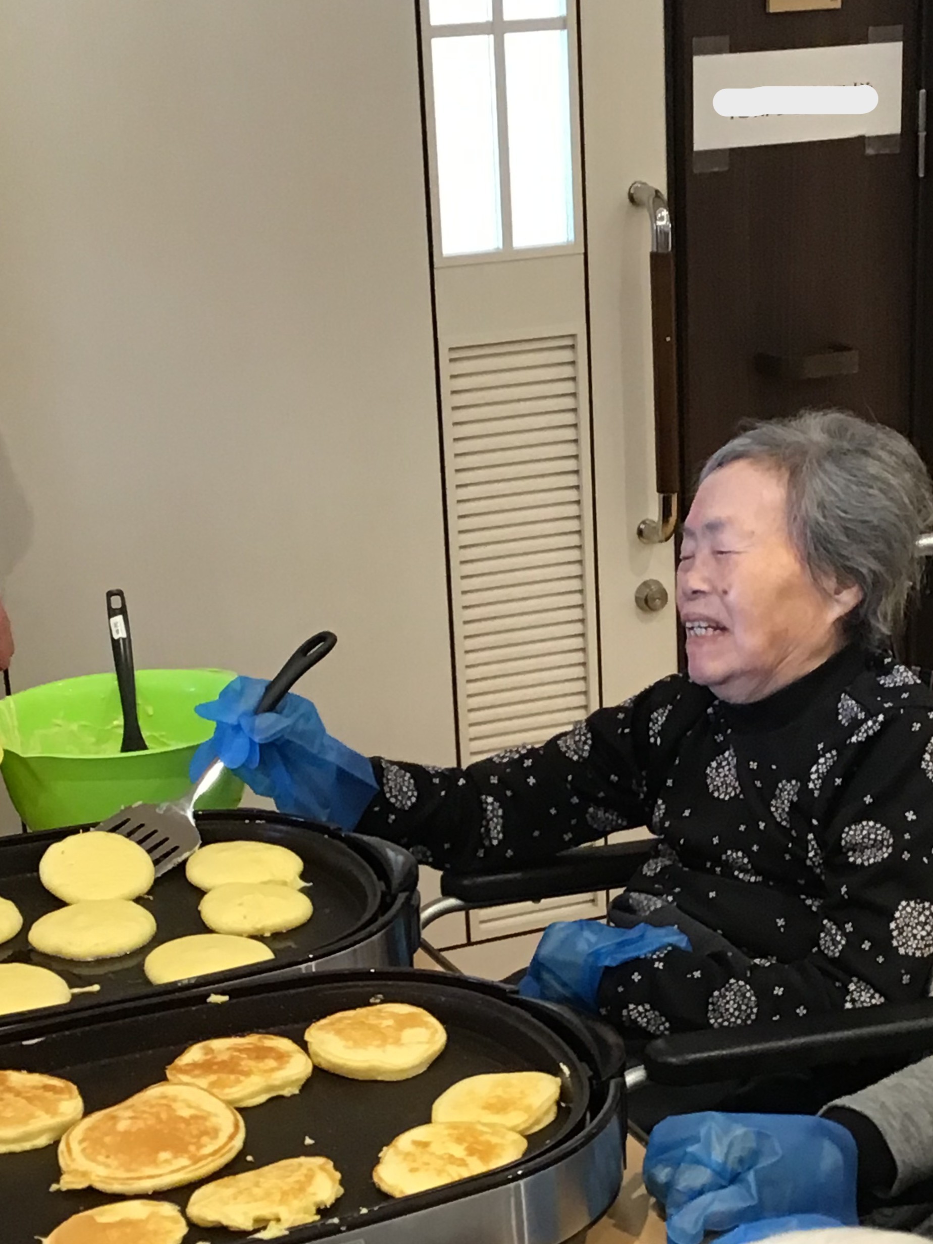 皆様で愛情いっぱいのホットケーキを作り、あんこ、生クリーム、メープルシロップ、チョコソース、マーガリンの中で好きなのを選んでいただき召し上がって頂きました。