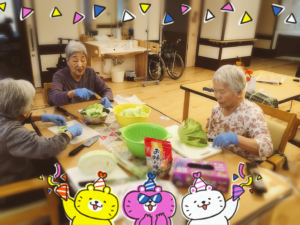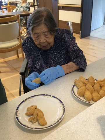 8月 蝉の鳴く声も日に日に増し、蒸し暑い今日このごろ。「何も食べたくない」と言われる、夏バテぎみな利用者様の為に、夏の定番料理 喉ごしさわやか素麺を作りをユニットで行いました!メイン料理の添えには、皆様好物のいなり寿司と鶏のから揚げ。稲荷にご飯を詰めるのは、101歳女性利用者様に手伝って頂き、見事綺麗に作って下さいました。素麺の薬味には、色どりよく野菜をのせて、今まで、薬味はネギだけで召し上がられてる 利用者様からは「こんな食べ方もあるのね」と今までと違った食べ方を楽しんで頂く事ができました。 皆様と一緒に作る料理は、本当においしかったです。楽しい昼食の時間を過ごすことができました。 (ユニット名)楓