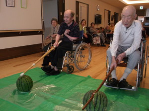 何度も苦労して割ったスイカは、皆で美味しく頂きました。(*^_^*)(葵)