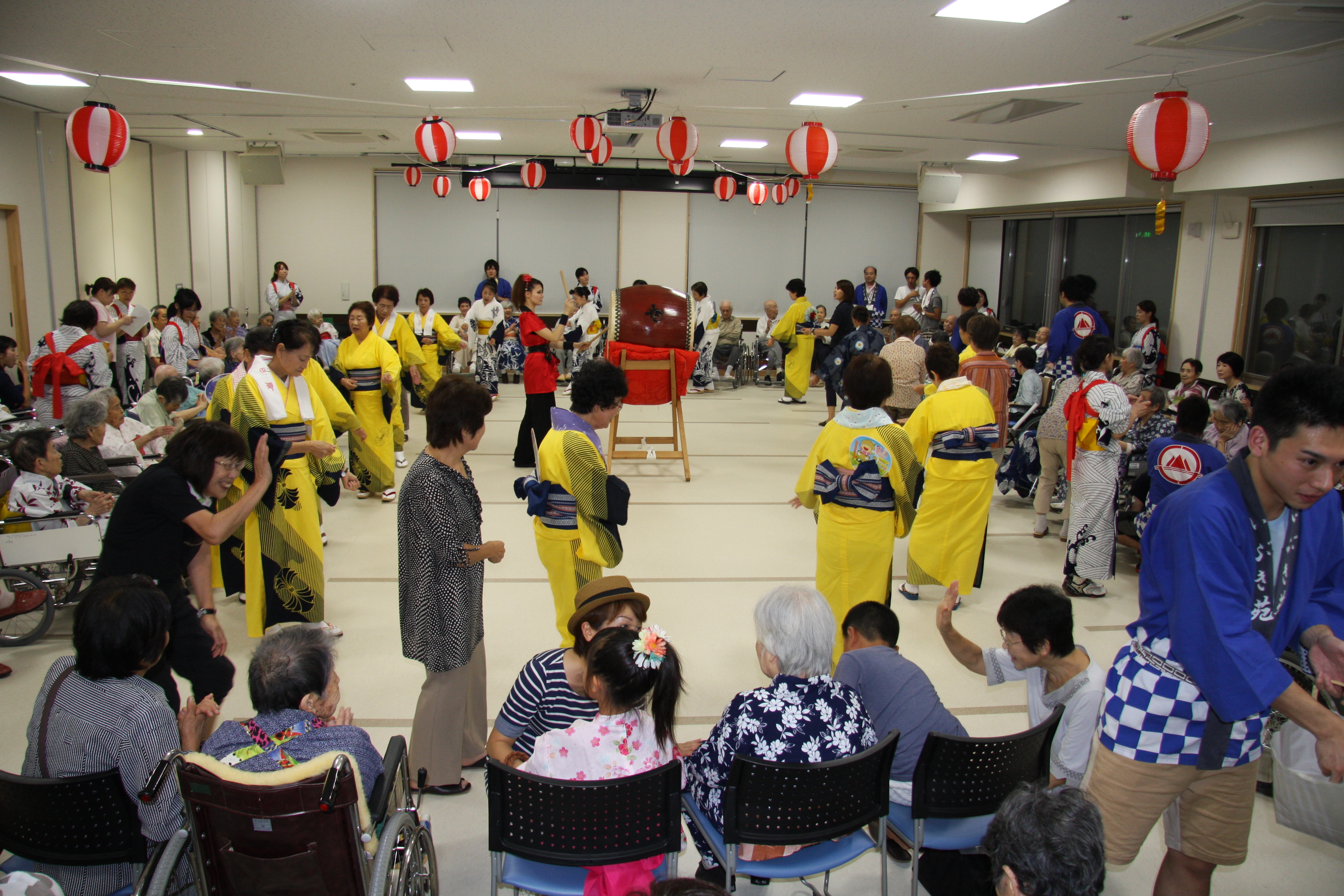 8月21日(金)、別館においての盆踊り大会を開催しました。オープニングは、師範の腕前を持つ職員が迫力ある太鼓演奏を披露しました。その後炭坑節やかわさき、春駒などの曲に合わせ盆踊りを行いました。浴衣を身にまとった、ご利用者様も踊りに参加されたり、手を動かされたりと楽しそうなご様子でした。