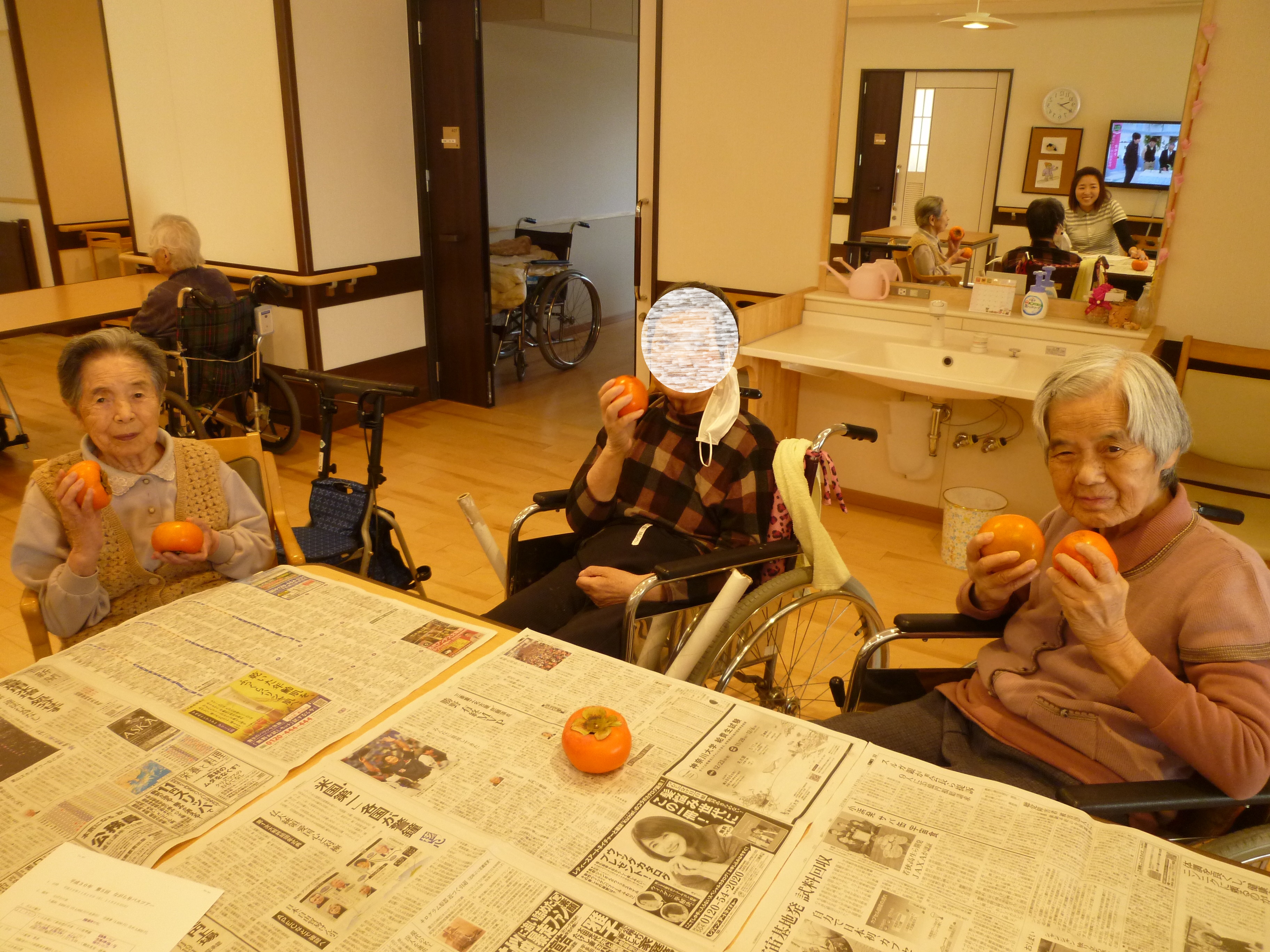 職員が持ってきた「柿」を入居者様の前でむき召し上がって頂きました。