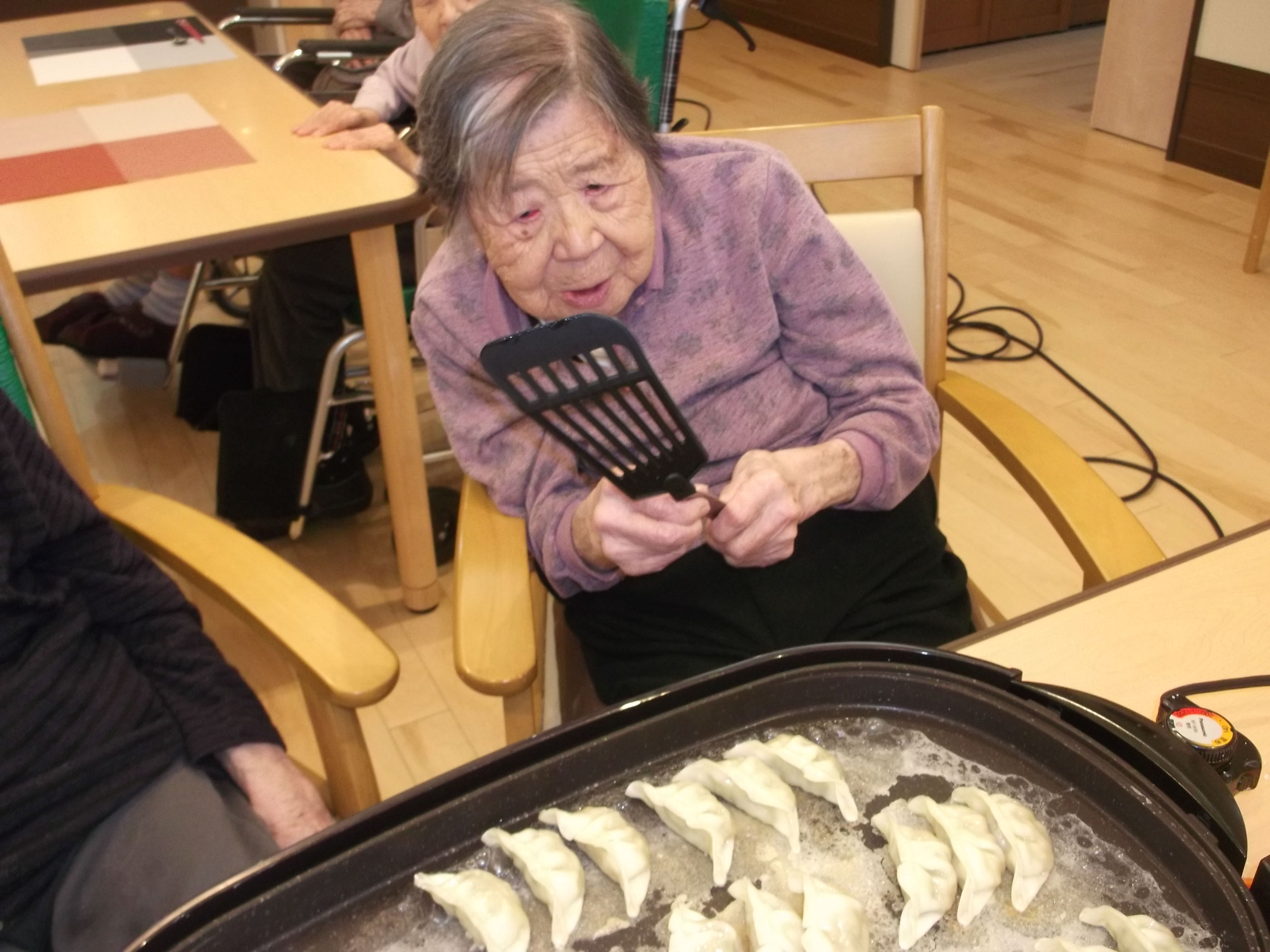 たくさんの餃子をホットプレートで焼く光景を見て、「こんな餃子の数見たことないわー」と驚きながら焼き終わるのを待たれていました。